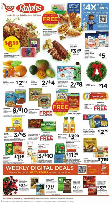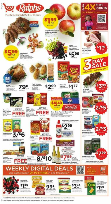 The Weekly Ad typically highlights a selection of products that are on sale for the week. These products may include fresh produce, meat, dairy, bakery items, canned goods, beverages, and more. In addition to regular discounts, the Weekly Ad often includes special promotions. These can include"Buy One, Get One Free"(BOGO) deals, mix-and-match sales, and discounts on larger quantities of items. Ralphs often aligns its Weekly Ad with seasonal and holiday events. You can find special offers and discounts during holidays like Thanksgiving, Christmas, and other seasonal occasions. it's a good idea to check our website for the Weekly Ad specific to your nearest store to find the latest savings and promotions.